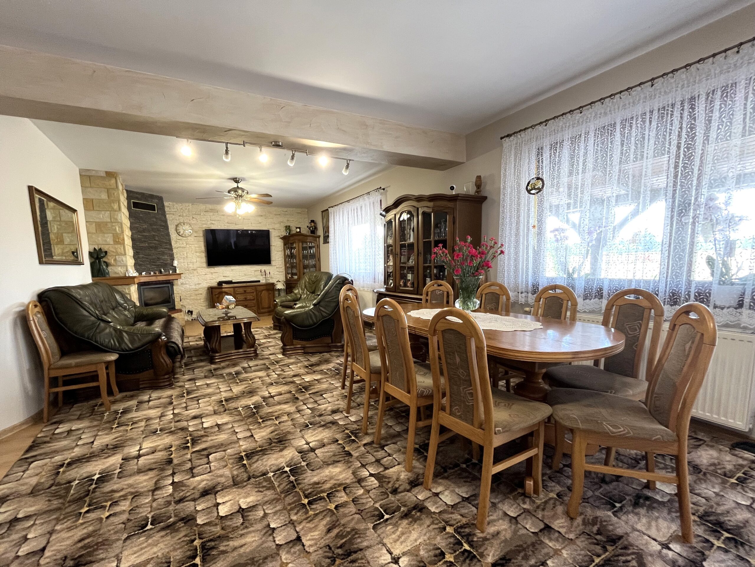 Duży salon z kominkiem, jadalnią i wyjściem na taras